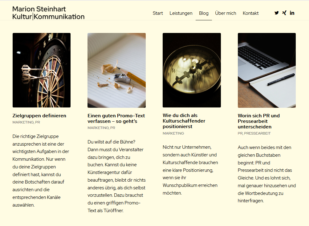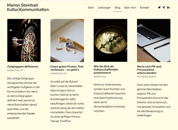 Mit ihrer kombinierten Erfahrung als Kulturjournalistin und als PR-Expertin unterstützt Marion Steinhart mit ihrem Blog Künstlerinnen und Künstler, Kulturhäuser und -institutionen darin, zielgerichtet Öffentlichkeitsarbeit zu machen und sichtbarer zu werden.