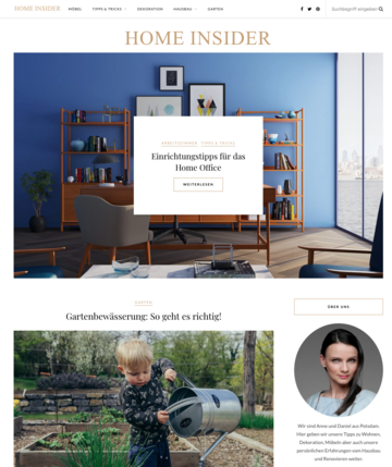 Der Home Insider berichtet seit 2008 über alle Aspekte des Wohnens. Angefangen beim Hauskauf oder der Renovierung einer Immobilie bis hin zur Einrichtung. Für Immobilienbesitzer gibt es nicht nur aktuelle Tipps und Tricks rund um das Mieten und Vermieten, sondern auch die neuesten Einrichtungstrends, sowie praktische Tipps für Garten, Balkon und Terrasse. Auch Haustiere finden beim Home Insider in einer eigenen Kategorie redaktionelle Beachtung.