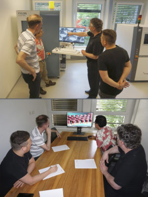 Menschen stehen vor einem Bildschirm und lassen sich die Inspektion erklärenRöntgeninspektion und Computertomographie in Echtzeit
