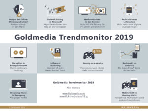 Der Goldmedia Trendmonitor 2019 befasst sich mit der Disruption im Bewegtbildmarkt, dem schwindenden Duopol und neuen Playern im Bereich Online-Werbung, den neuesten Trends in der Gamesbranche wie Gaming-as-a-Service und Mobile Shift. Hinterfragt wird, warum Audio zum neuen Leitmedium avanciert, ob A-VoD die Rettung für TV-Sender und Industrie sein kann und wie die Buchbranche ihre Leser an Bord hält. Der Trendmonitor 2019 wirft auch einen Blick auf die zu erwartenden Bewegungen im Streamingmarkt, erläutert, wie Algorithmen den Weg an die Kinokassen finden und warum Nanos im Influencer Marketing Trend werden.