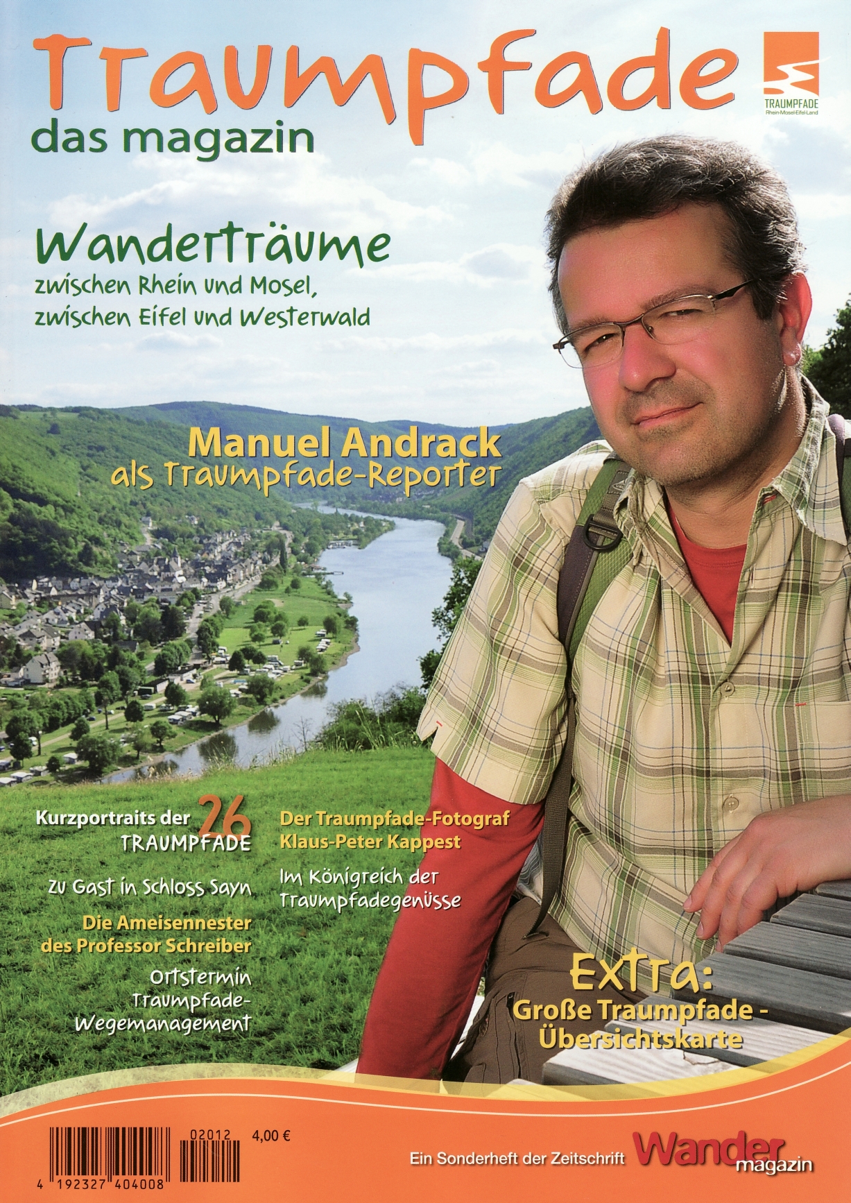 Auf dem Cover des Magazins ist Deutschlands wohl bekanntester Wanderer abgebildet: Manuel Andrack, 13 Jahre lang Partner von Harald Schmidt im Fernsehstudio, bevor er seine Liebe zum Wandern entdeckte und zahlreiche Bücher darüber verfasste. Als Traumpfade-Reporter schildert Andrack einen höchst merkwürdigen Traum: „Ich hatte zwei riesige Nordic-Walking-Stöcke dabei, die an meinen Händen festgewachsen waren. An den Füßen hatte ich eine Art Siebenmeilenstiefel, denn ohne aus der Puste zu kommen, erklomm ich den steilen Weg hinaus aus dem Elzbachtal … “