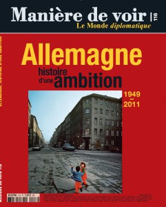 „Allemagne – histoire d’une ambition“ (Deutschland – Die Geschichte eines Anspruchs): So lautet das Thema der April/Mai-Ausgabe der französischen Zeitschrift Manière de voir, die ab dem 23. März im deutschen Handel erhältlich ist. Das alle zwei Monate von der Groupe La Vie-Le Monde innerhalb der Markenfamilie von Le Monde diplomatique publizierte Magazin widmet sich in der 100-seitigen Ausgabe der deutschen Geschichte von 1949 bis 2011: vom Kalten Krieg, dessen Fronten wohl in kaum einer Weltgegend so verhärtet waren wie im Herzen Europas, über die Zeit der euphorisch begonnenen, mühsam vollendeten Vereinigung beider deutscher Staaten bis zur Gegenwart, in der ein erstarktes Deutschland seiner globalen Verantwortung gerecht werden muss. Das Magazin bietet neben hervorragend geschriebenen aktuellen Analysen auch klassische Essays etwa von Karl Jaspers oder Heinz Abosch. Mit zahlreichen Karten und Infografiken führt Manière de voir zentrale Aspekte der deutschen Politik-, Wirtschafts- und Sozialgeschichte vor Augen, abgerundet wird das Heft durch ein biographisches Kapitel, das prägende Persönlichkeiten der zurückliegenden Jahrzehnte vorstellt: von Konrad Adenauer und Walter Ulbricht über Wolf Biermann, Heiner Müller und Heinrich Böll bis zu Fatih Akın und Anselm Kiefer.