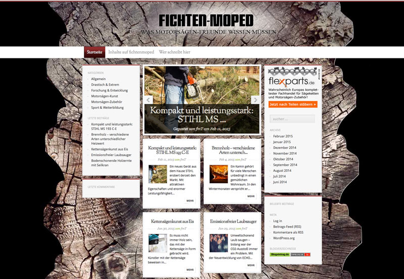Mit Ihrem Blog fichtenmoped.de berichten die Motorsägen-Spezialisten von flexparts über Aktuelles, Wissenswertes und Skurriles aus der Community der Motorsägen-Freunde. Das Team um Inge und Peter Steigerwald möchte mit dem Magazin das Interesse an dem vielfältigen Werkzeug weiter steigern. ...read more