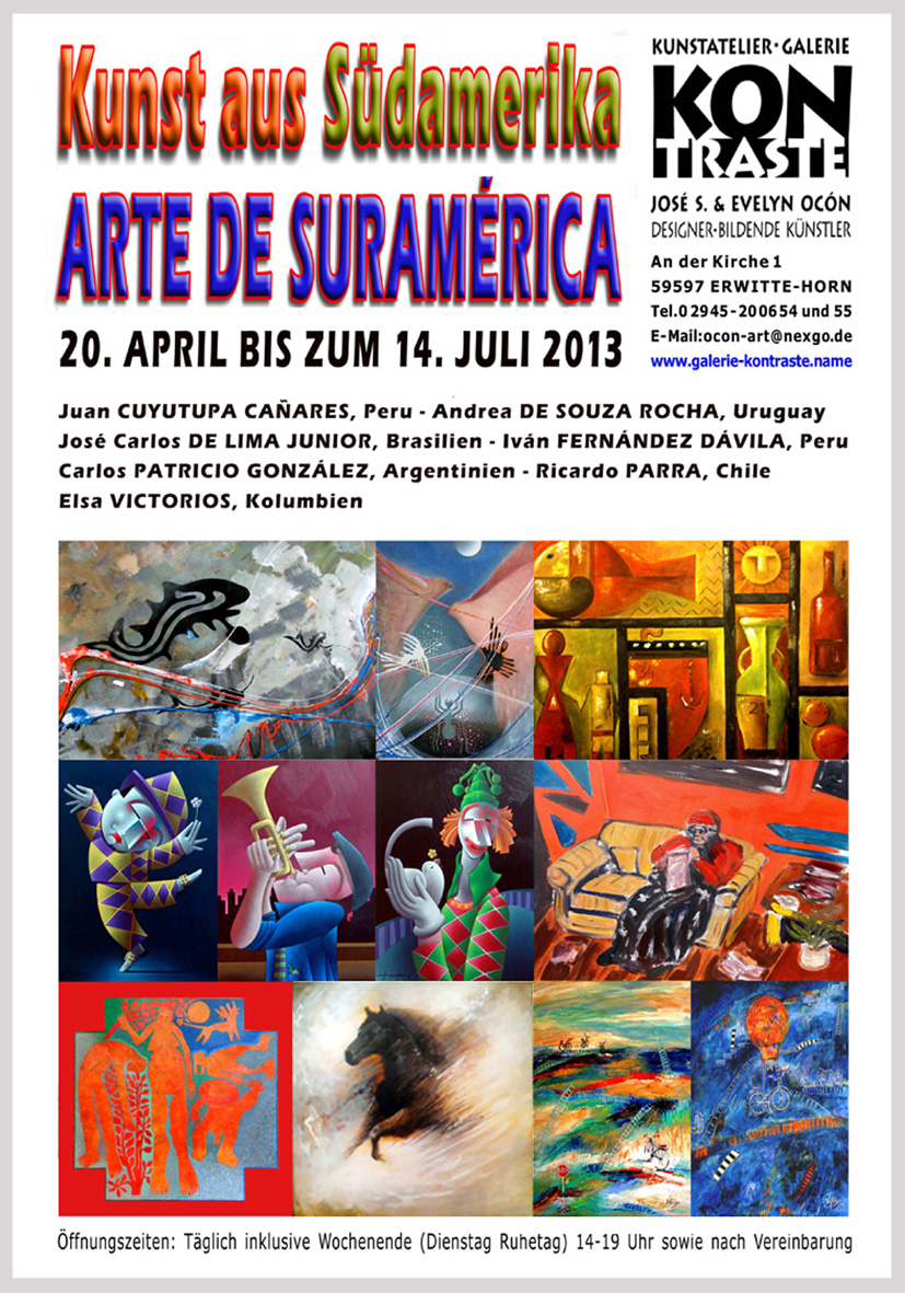 Ausstellung „KUNST AUS SÜDAMERIKA“ Zum ersten Mal laden wir zu einer Ausstellung mit Kunst aus Südamerika ein. Zwei Künstlerinnen und 5 Künstler aus Argentinien, Brasilien, Chile, Kolumbien, Peru und Uruguay präsentieren jeweils eine Auswahl ihres Könnens. Sie alle sind GegenwartskünstlerInnen, die unterschiedliche Kulturen, Traditionen und künstlerische Tendenzen ihrer Heimatländer vertreten. ...read more