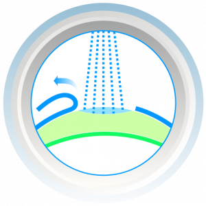 Der benötigte Kreis-runde Hornhautschnitt wird nun durch den Femtosekunden-Laser ausgeführt. Da der Laserstrahl exakt definiert ist, erzeugt er auf der vorab eingestellten Tiefe unzählige winzige Bläschen. Diese schließen sich letztendlich zusammen und es entsteht ein präzise geschnittener und höchst stabiler Hornhaut-Flap.