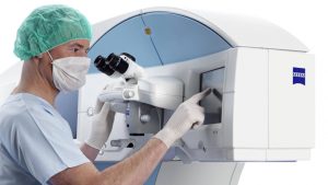 Zur Sicherheit der Patienten:innen wird der Vorgang mittels OP-Mikroskops und Monitor durch den Chirurgen beobachtet und nachvollzogen. Sobald der Hornhaut-Deckel (Flap) mithilfe des Femtosekunden-Lasers erzeugt ist, wird der Fixations-Ring vom Auge abgenommen. Der Flap wird anschließend mittels feinstem Instrument aufgeklappt. Das Laser-System für diesen Eingriff ist der VisuMax Femtolaser des Unternehmens CARL ZEISS.
