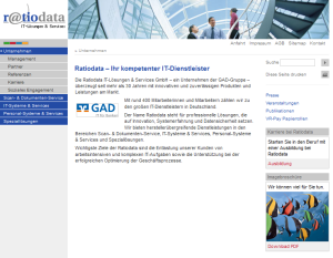Die Ratiodata IT-Lösungen & Services GmbH ist ein Unternehmen der GAD-Gruppe. Sie zählt mit ca. 400 Mitarbeiterinnen und Mitarbeitern und einem Umsatz von rund 100 Mio. Euro zu den großen Systemhäusern und IT-Dienstleistern in Deutschland. Zum Leistungsspektrum gehören professionelle Dienstleistungen in den Bereichen Scan- & Dokumenten-Service, IT-Systeme & Services, Personal-Systeme & Services und Speziallösungen.