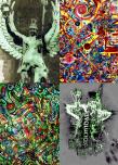 Filigran virbrierende Muster in vielschichtigen Farben treffen auf Engel und Flügel. Abstrakte Gemälde von Markus Frede und Gabriel Burs Zeichnungen und Schablonenkunst. Muster der Seele und der Inspiration.
