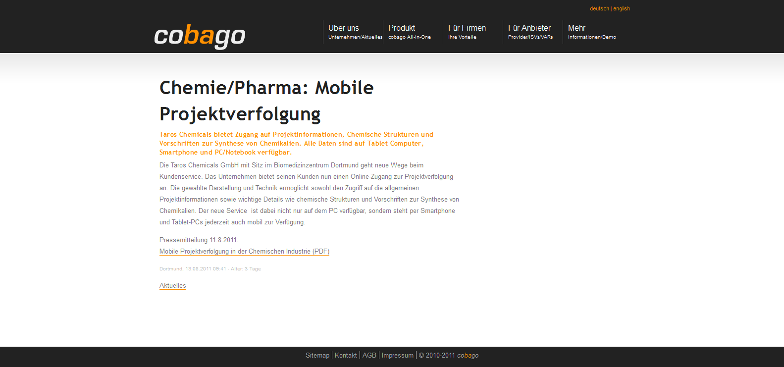 „An den neuen mobilen Geräten führt kein Weg vorbei. Aber hochsensible Dienste und mobile Datennutzung erfordern eine Sicherheitstechnik, die ebenso vertraulichen Informationsaustausch garantiert wie auch flexibel und verlässlich ist“, erläutert Dr. Dieter Kramps, Geschäftsführer der cobago.“Anbieter aller Branchen können so auch sehr werthaltige Dienstleistungen auf einfache Weise jederzeit mobil zur Verfügung stellen. Für Taros und ihre Kunden haben wir diese Technik nun erstmals auch im Chemie/Pharma Bereich bereitgestellt.“