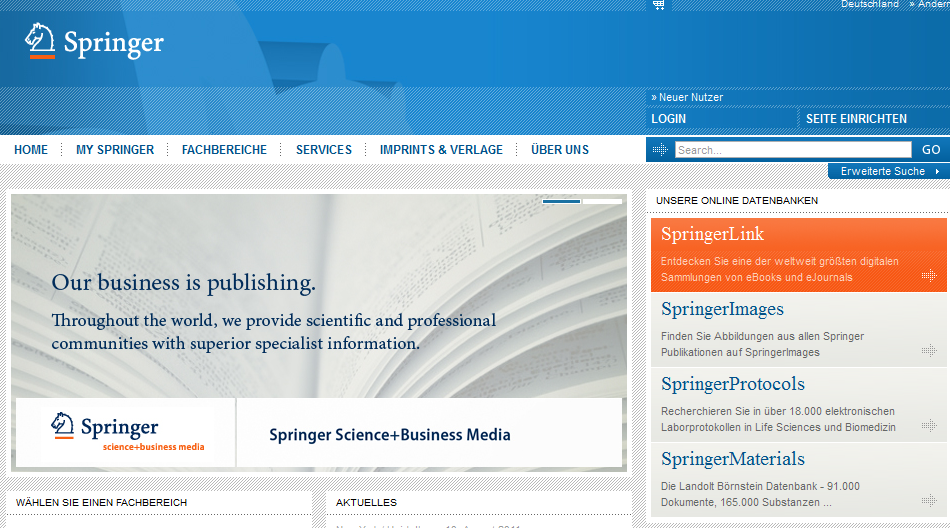 Springer (www.springer.com) ist ein international führender Wissenschaftsverlag, der hochwertige Inhalte in innovativen Informationsprodukten und Dienstleistungen publiziert. Springer ist Teil der Fachverlagsgruppe Springer Science+Business Media und Springer ist Teil der Fachverlagsgruppe Springer Science+Business Media und veröffentlicht nahezu 500 Zeitschriften für wissenschaftliche Gesellschaften und Berufsverbände. Im Bereich Science, Technology, Medicine (STM) veröffentlicht das Unternehmen jährlich etwa 2.000 Fachjournale, mehr als 7.000 neue Bücher und die weltweit umfangreichste eBook Collection. Mit rund 5.500 Mitarbeitern hat die Gruppe Niederlassungen in über 20 Ländern in Europa, den USA und Asien.