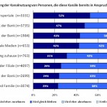 Bei der Analyse des Nutzungsverhaltens von Personen, die die entsprechenden Kanäle bereits nutzen, zeigt sich, dass vor allem die Online-Recherche und -Beratung deutlich zunehmen wird: Vergleichsportale werden von 52 % häufiger herangezogen, der Internet-Auftritt von Banken von 47 %. Nur bei 3 % der Personen, die bereits Vergleichsportale bzw. den Internet-Auftritt von Banken besuchen, wird deren Nutzung zurückgehen. Auch der E-Mail-Kontakt mit der Bank sowie Social-Media-Anwendungen werden in Zukunft zur Bankberatung vermehrt in Anspruch genommen (43 % bzw. 42 %). Die Hälfte der Personen, die per E-Mail mit ihrer Bank bzw. ihrem Berater in Kontakt treten, wird diese Form der Kontaktaufnahme wie bisher nutzen.