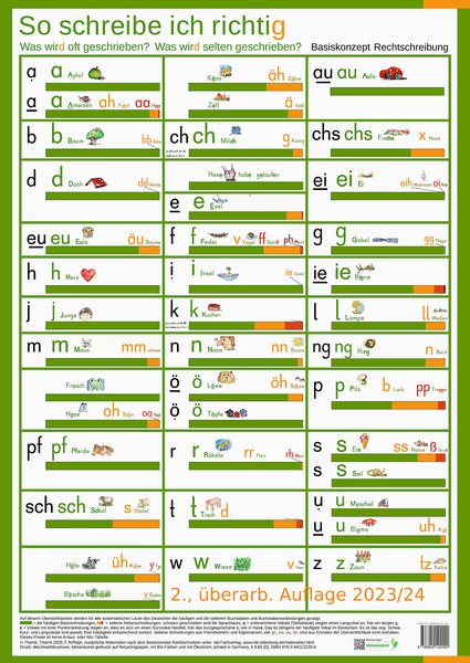 Dieses große und anschauliche Übersichtsposter zeigt auf, welche Buchstaben und Buchstabenverbindungen wie häufig für die Laute des Deutschen (nach der Standardlautung) geschrieben werden. Die Daten beruhen auf einer 100.000-er Auszählung von Laut-Schrifteinheiten-Korrespondenzen im Deutschen. Empfohlener Einsatz: ab Ende der zweiten Klasse. Ein weiteres (dazu passendes) Übersichtsposter "Alle Laute" ist für jüngere Kinder, ab 5 Jahren, geeignet.