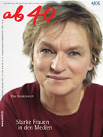 Die 'ab40' geht auf Spurensuche nach weiblicher Kreativität in den Biographien von Frauen ab 40 - 'wie sie leben, was sie denken, wer sie sind'. In der zweiten Lebenshälfte zu leben und sich mit anderen Frauen ab 40 auszutauschen ist ein spannender Prozeß, den wir mit unserer Zeitschrift und auch mit dieser Webausgabe gerne begleiten, unterstützen und sichtbar machen.