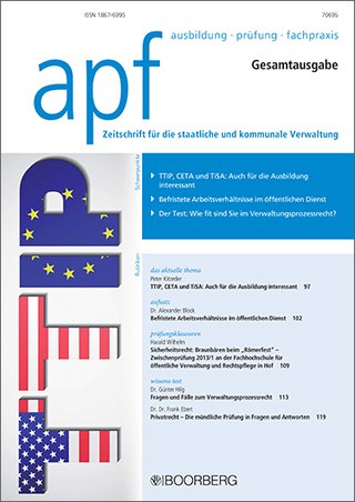 Die "apf" ist die Fachzeitschrift für die Mitarbeiterinnen und Mitarbeiter des mittleren und des gehobenen Dienstes in Ausbildung, Fort- und Weiterbildung. Die "apf" zeichnet sich vor allem durch wissenschaftliche Darstellungen aus, die sich an den Bedürfnissen der Aus- und Fortzubildenden orientieren. In Aufsätzen, Testfragen, kleinen Fallbeispielen, Prüfungsaufgaben mit Lösungen sowie anhand aktueller Gerichtsentscheidungen werden den "apf"-Lesern die für die Verwaltungspraxis maßgeblichen Rechtsbereiche erschlossen. Hinweise und Berichte über wichtige Veranstaltungen, Buchbesprechungen und kritische Kommentierungen runden das Profil der Zeitschrift ab.