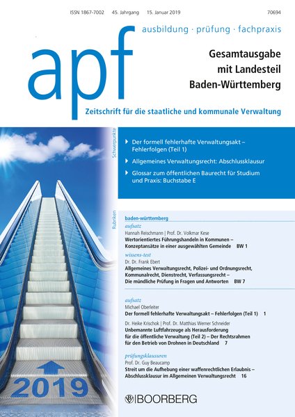 Die "apf" ist die Fachzeitschrift für die Mitarbeiterinnen und Mitarbeiter des mittleren und des gehobenen Dienstes in Ausbildung, Fort- und Weiterbildung in Baden-Württemberg. Die "apf" zeichnet sich vor allem durch wissenschaftliche Darstellungen aus, die sich an den Bedürfnissen der Aus- und Fortzubildenden orientieren. In Aufsätzen, Testfragen, kleinen Fallbeispielen, Prüfungsaufgaben mit Lösungen sowie anhand aktueller Gerichtsentscheidungen werden den "apf"-Lesern die für die Verwaltungspraxis maßgeblichen Rechtsbereiche erschlossen. Hinweise und Berichte über wichtige Veranstaltungen, Buchbesprechungen und kritische Kommentierungen runden das Profil der Zeitschrift ab.