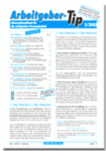 Monatlich erscheinender Informationsdienst für Arbeitgeber und Vorgesetzte. Das Hauptanliegen des Arbeitgeber-Tip ist es, Ihnen Monat für Monat die wichtigsten Kurzinformationen in einer leichtverständlichen Sprache für Ihr Unternehmen zum Arbeitsrecht, Sozialversicherungsrecht, Lohnsteuer und Personalführung anzubieten. Dabei informiert Sie der Arbeitgeber-Tip über Ihre Rechte, Pflichten und Gestaltungsmöglichkeiten als Arbeitgeber. Arbeitshilfen und Checklisten zeigen Ihnen die richtigen Schritte zu einem rechtlich abgesicherten Verhalten gegenüber Arbeitnehmern, dem Finanzamt und den Sozialversicherungsträgern.
