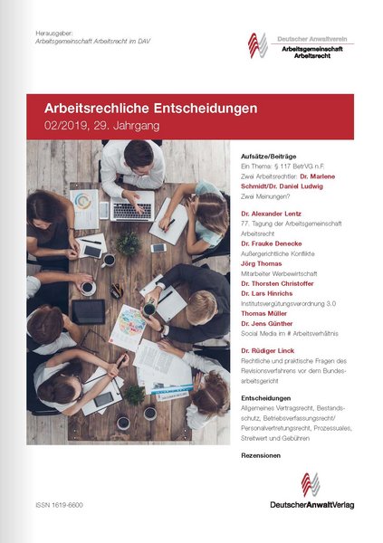 Viermal jährlich bietet die Mitgliederzeitschrift der Arbeitsgemeinschaft Arbeitsrecht im DAV aktuelle Informationen zu interessanten Fragen des Arbeitsrechts. Den Schwerpunkt der Zeitschrift bildet ein umfangreicher Überblick über aktuelle Entscheidungen; praxisorientierte Beiträge und Mitteilungen ergänzen das Angebot.