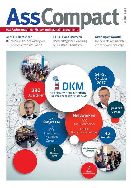 AssCompact ist das Fachmagazin für Führungskräfte und Entscheider der Finanz- und Versicherungswirtschaft. Eine Zeitschrift vom Vertrieb - für den Vertrieb. Mit praxisorientierten, Interviews, Urteilen und Kurzmeldungen informiert AssCompact seine Leser und präsentiert damit am Markt erfolgreiche Konzept- und Lösungsansätze für das Tagesgeschäft.