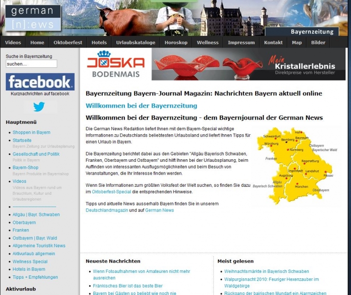 Die Bayernzeitung als Spezialausgabe der German News berichtet wöchentlich über Deutschlands Urlaubsland Nr. 1 und liefert aktuelle Informationen aus den bayerischen Urlaubsgebieten (Franken, Oberbayern, Ostbayern / Bayerischer Wald, Allgäu und Schwaben) und zu deren Veranstaltungen in den Städten und Ferienregionen. Die Redaktion gibt dazu Tipps und Empfehlungen und liefert Vorortberichte für die Urlaubsplanung in Bayern.