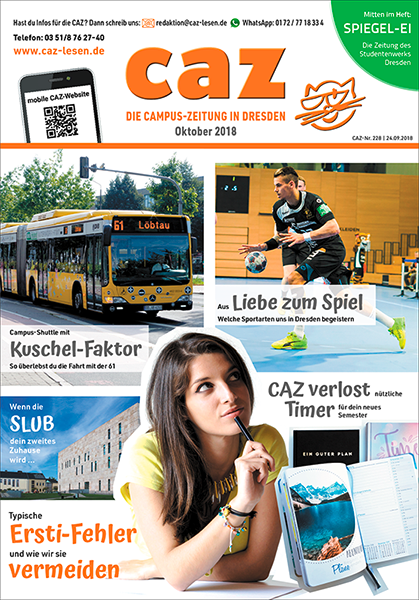 Die Campus-Zeitung CAZ ist die Zeitung für Studierende aller Dresdner Hochschulen. Die Printausgabe der CAZ erscheint einmal monatlich und bringt in kurzer, ungekünstelter Form auf umweltfreundlichem Zeitungspapier gedruckt News und Tipps fürs Campusleben. Ein optimales Umfeld für Ihre Werbung!