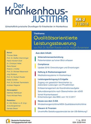 Die neue juristische Fachzeitschrift wendet sich als fundierte Orientierungshilfe vorrangig an die Entscheidungsträger im Krankenhausunternehmen: Organe, Krankenhausdirektoren, Personalleiter und Krankenhausjustitiare. Ferner gehören auch Krankenhausberater (Juristen, Steuerberater/ Wirtschaftsprüfer, Unternehmensberater) zum Zielleserkreis. An der Schnittstelle zwischen Wirtschaft und Recht werden aktuelle Fragestellungen rund um den Krankenhausbetrieb und das Krankenhausunternehmen thematisiert. Die thematische Zusammenstellung orientiert sich dabei an den betriebswirtschaftlich wichtigen Entscheidungsfeldern im Krankenhausbetrieb. Die Zeitschrift enthält folgende ständige Rubriken: Die Führungskraft Unternehmensentwicklung Haftung & Risikomanagement Personal Leistungserbringung & Entgelte Steuern & Finanzen VdKP-Nachrichten