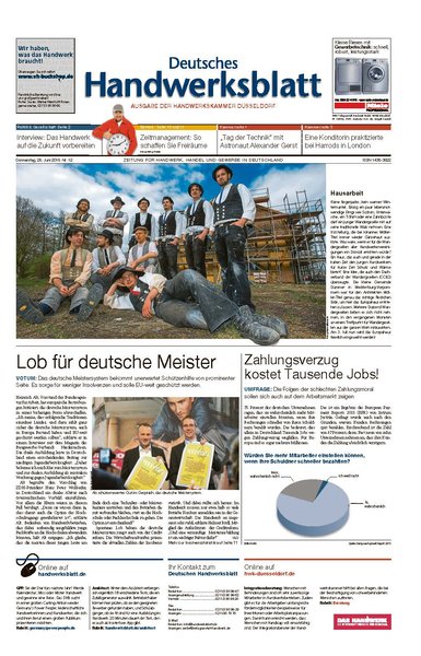 Seit Jahrzehnten ist das Deutsche Handwerksblatt das Entscheidermedium für Unternehmer im Handwerk. Als Marktführer im Verbreitungsgebiet informiert es mit seiner Gesamtauflage nahezu jeden dritten Handwerksbetrieb in Deutschland. Inhaber, Geschäftsführer und leitende Angestellte in Handwerksbetrieben ziehen wichtige Informationen, die sie für ihren betrieblichen Alltag brauchen, aus ihrem Handwerksblatt.