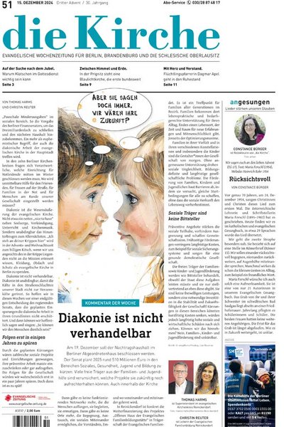 Die Evangelische Wochenzeitung die Kirche bietet wöchentlich auf 16 Seiten aktuelle Berichte, Reportagen und Interviews aus Berlin, Brandenburg und der schlesischen Oberlausitz - von Frankfurt an der Oder bis Wittenberge, von Prenzlau über Berlin bis nach Görlitz. Darüber hinaus informiert sie die Leserinnen und Leser über wichtige Ereignisse in der Evangelischen Kirche in Deutschland (EKD), in den anderen Landeskirchen und in der weltweiten Ökumene. Die Kirchenzeitung versteht sich als öffentliches Forum für alle Mitglieder und Einrichtungen der Landeskirche. Sie ist offen für alle, die sich für die Evangelische Kirche interessieren oder sich über deren Positionen informieren möchten. Innerkirchliche, aber auch politische und gesellschaftliche Entwicklungen werden aus evangelischem Blickwinkel kritisch begleitet, kommentiert und diskutiert. Menschen, die sich aufgrund ihres Glaubens in Kirche und Gesellschaft engagieren, werden vorgestellt. Orientierung für den Lebensalltag mit der Bibel und dem Glauben, aktuelle theologische Diskussionen zu gegenwärtigen Entwicklungen finden sich ebenso in der Kirchenzeitung wie die Lebensberatung. Neben den aktuellen Themen kommt auch die Unterhaltung nicht zu kurz.