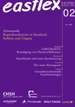 eastlex ist eine sechsmal jährlich erscheinende Fachzeitschrift für Wirtschafts- und Steuerrecht in Mittel- und Osteuropa. Jedes Heft ein Schwerpunktthema, länderweise behandelt. Als Kernländer stehen Ungarn, Tschechien, Slowenien, Kroatien, Polen, Slowakei, Rumänien, Russland, Bulgarien, Serbien und Montenegro im Vordergrund. Jeder Beitrag mit nützlichen Links und Glossar mit den wichtigsten Fachtermini in der Landessprache. Checklisten, Judikatur und Praxistipps sowie jetzt neu in jedem Heft: Gesetzgebungs-Radar, der dem Leser einen schnellen Überblick über die wichtigsten Rechtsentwicklungen und Reformvorhaben in Mittel- und Osteuroparecht bietet.