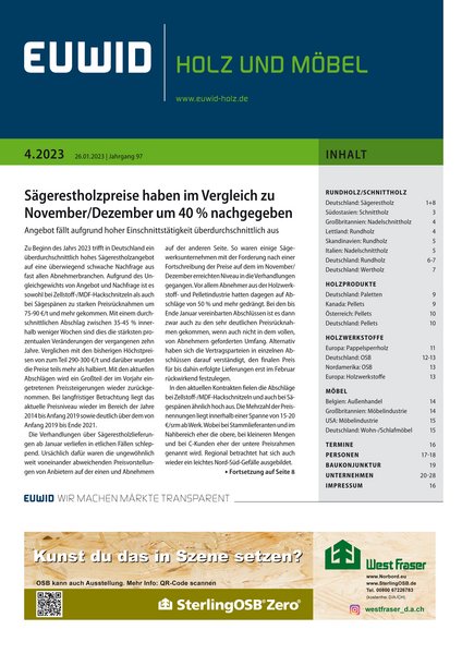 Mit exklusiven, unabhängigen und stets aktuellen Informationen rund um die internationale Holz- und Holzwerkstoffbranche – von der Forstwirtschaft über die holzbe- und holzverarbeitende Industrie bis hin zum Handel – hat sich EUWID im Verlauf der letzten Jahrzehnte in ganz Europa einen Namen gemacht.