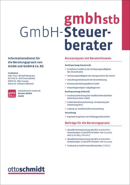 Der "GmbH-Steuerberater" (GmbH-StB) kanalisiert monatlich die Informationsflut auf dem Gebiet der GmbH und & GmbH & Co. KG. Jeder Beitrag kommt direkt auf den Punkt und enthält konkrete Tipps für Ihre tägliche Beratungspraxis - so ersparen Sie sich mühsame Recherchen und Interpretationen. Dabei führt Sie der strukturierte Aufbau der Zeitschrift schnell zum gesuchten Thema.