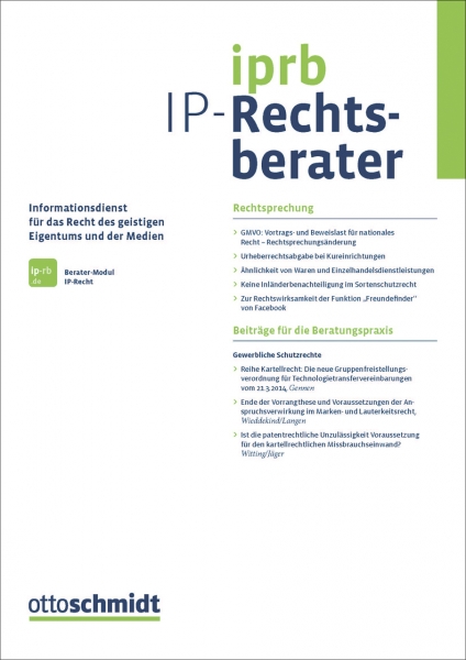 Das neue Produkt aus der Familie der Beraterzeitschriften des Verlages Dr. Otto Schmidt: Der "IP-Rechtsberater" (IPRB) informiert monatlich über die aktuellen Entwicklungen im Bereich des geistigen Eigentums (Intellectual Property), das heißt dem Gewerblichen Rechtsschutz, dem Wettbewerbsrecht, dem Urheberrecht sowie den damit zusammenhängenden kartellund patentrechtlichen Fragen.