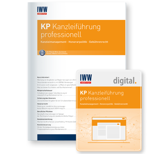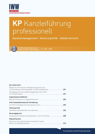 KP Kanzleiführung professionell ist der Informationsdienst für aktives Kanzleimanagement: Berufskollegen und Experten aus der Praxis unterstützen den Steuerberater mit konkreten Empfehlungen zum Berufsrecht, zur Kanzleiorganisation und zur Steigerung der betriebswirtschaftlichen Erträge.