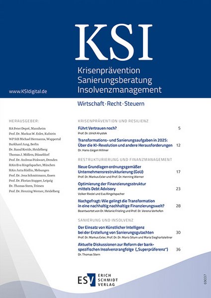 Die Zeitschrift KSI verstärkt 2025 optisch und inhaltlich ihr Angebot. Der neue Titel '''Krisenprävention Sanierungsberatung Insolvenzmanagement''' und das neu formierte Herausgebergremium bieten Informationen zu Krisenprävention und Resilienz, zu Restrukturierung und Finanzmanagement sowie zu Insolvenz und noch mehr Best Practises, aktuelle Fallstudien und praktische Arbeitshilfen.