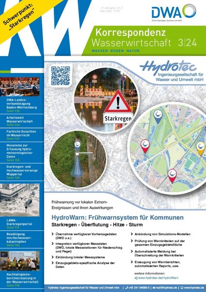 Die KW Korrespondenz Wasserwirtschaft ist das Organ der DWA für allgemein wasserwirtschaftliche Themen: Hydrologie, Wasserbewirtschaftung, Gewässer und Boden, Wasserbau, Wasserkraft, Gewässerökologie, Grundwasser, Hydromechanik, Hochwasserschutz. Dazu kommen Querschnittsthemen wie Recht, Wirtschaft, Bildung, Internationale Zusammenarbeit. Neben ausführlichen Fachbeiträgen bietet die KW umfassende Informationen aus der Branche: Neues aus der Arbeit der DWA und ihrer Gremien, aktuelle Nachrichten aus Wissenschaft und Praxis sowie Kurznachrichten - alles was für Wasserwirtschaftler wichtig ist -, Namen und Köpfe, Rechtsprechung, Dissertationen, Bücher und andere Medien, Veranstaltungen.