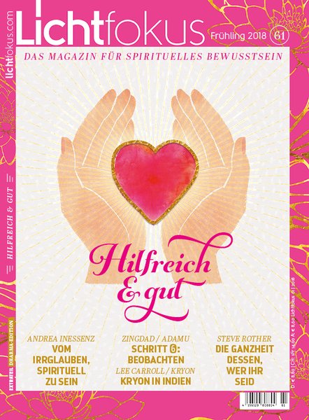 Was du fokussierst, das erschaffst du! „Der klare, ungeteilte Fokus wird täglich wichtiger, und zwar der fokussierte Fokus auf das Lichtvolle und Klare, auf das Hineinwachsen ins höchste Potenzial.“ (Reindjen Anselmi) Es lohnt sich, die bisher erschienenen Lichtfokus-Ausgaben aus dem Blickwinkel „im Fokus sein - den Fokus halten“ nochmals zu lesen. In jeder Ausgabe finden sich viele Hinweise und Techniken wie dies zu realisieren ist. Viele der Artikel haben zudem noch die Qualität, den Zustand des Im-Fokussiert-Seins direkt erfahrbar zu machen. Reindjen Anselmi und Cecilia Sifontes geben uns mit einer Leseprobe ihres neuen Buches einen kompakten Überblick der Thematik. Der Fokus ist der erste Schlüssel zur Meisterschaft. Die Autorinnen beschreiben die verschiedenen Fokus-Arten: Fokus der Persönlichkeit, Fokus des Lichtkörpers und Fokus der Seele, und benennen Wirkungsweisen und Funktionen. Eindringlich wird an den verantwortungsvollen Umgang mit diesen Kräften erinnert.