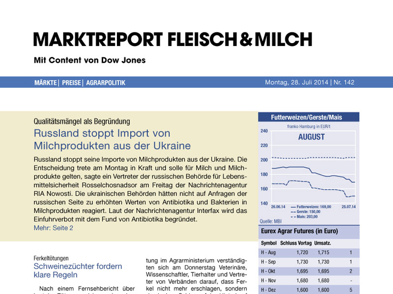 Marktreport Fleisch & Milch berichtet börsentäglich über die Fleisch- und Milchmärkte in Deutschland, Europa und weltweit. Analysen und Hintergrundberichte informieren über Trends und Entwicklungen und unterstützen bei unternehmerischen Entscheidungen.