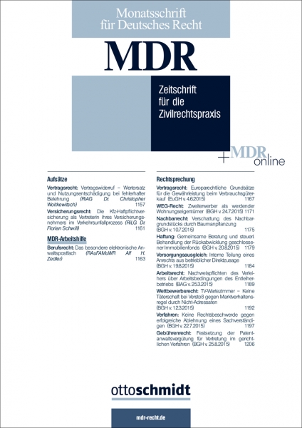 Die MDR, das seit Jahrzehnten bewährte Arbeitsmittel für die juristische Praxis, richtet sich an Anwälte und Richter, deren Hauptbetätigungsfeld das Zivilrecht ist. Die Fachzeitschrift MDR – Monatsschrift für Deutsches Recht ist seit Jahrzehnten das bewährte Arbeitsmittel für die Zivilrechtspraxis. Speziell auf die Bedürfnisse der Anwälte und Richter zugeschnitten, kanalisiert sie die Informationsflut, gibt wichtige Praxishilfen und hält gleichzeitig auf dem neuesten Stand der Rechtsprechung. Aktuelle Aufsätze aus den wichtigsten zivilrechtlichen Rechtsbereichen bieten in kurzer und prägnanter Form praxisorientierte Antworten und Gestaltungsvorschläge. Die umfangreich abgedruckte Rechtsprechung wird komprimiert wiedergegeben und konzentriert sich auf die wichtigsten zivilrechtlichen Entscheidungen. Der MDR-Report bietet mit seinen Kurznachrichten einen aktuellen Überblick über Gesetzgebung, aktuelle Rechtsprechung und neue Bücher. Ab sofort umfasst das MDR-Abonnement zusätzlich zur Zeitschrift den online-Zugriff auf hochwertige Praktiker-Literatur aus dem Verlag Dr. Otto Schmidt: - Erman - BGB: Der praktische und umfassende Handkommentar in der brandaktuellen 13. Neuauflage (Stand August 2011). - Wurm/Wagner/Zartmann – Das Rechtsformularbuch: Die aktuelle Ausgabe des Standardwerkes für mustergültige Rechtsgestaltung in der Praxis. Schneider – Die Klage im Zivilprozess: Das gesamte Klageverfahren mit Beispielen, Schriftsatzmustern und Tipps für Strategien in der 3. Auflage. Diepold/Hintzen – Musteranträge für Pfändung und Überweisung: 200 Musteranträge in alphabetischer Reihenfolge zur Pfändung sämtlicher Forderungen und Rechte in der 9. Auflage. Salten/Gräve – Gerichtliches Mahnverfahren und Zwangsvollstreckung: Alles zur effizienten Durchsetzung von Forderungen im Wege des Mahnverfahrens in der 4. Auflage. MDR online enthält weiter: - MDR-Archiv: Alle Entscheidungen und Aufsätze seit 1981 mit direkter Verlinkung zu Volltexten und Gesetzen (bisher auf CD). Orts- und Gerichtsverzeichnis 2011: Anschriften und Telekommunikationsdaten der ordentlichen Gerichte und Fachgerichte, sowie der Staatsanwaltschaften, Justizvollzugsanstalten, Anstalten des Maßregelvollzugs und der Finanzbehörden.