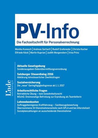 Die PV-Info – Fachzeitschrift für Personalverrechner behandelt sämtliche aktuelle Themen der Personalverrechnung, orientiert an den Bedürfnissen der Personalverrechner in Betrieben, wobei auf branchenspezifische Fragen eingegangen wird. Fallbeispiele ermöglichen die direkte Anwendung von Neuerungen im Arbeits-, Sozialversicherungs- und Lohnsteuerrecht.