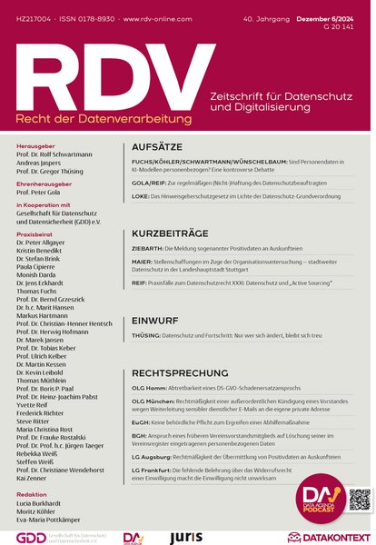 Die Fachzeitschrift für Datenschutz-, Informations- und Kommunikationsrecht informiert sechsmal jährlich über rechtspolitische Entwicklungen im nationalen und internationalen Bereich. Neben den Fachbeiträgen namhafter Datenschutzexperten und Juristen, die sich praxisgerecht an der jeweils aktuellen Rechtsentwicklung und Rechtsprechung orientieren, bietet RDV einen Rechtsprechungsteil mit Auszügen aus wegbereitenden, wichtigen Urteilen sowie Berichte und Informationen aus der EU, der Gesetzgebung, dem Bundestag und den Ländern.