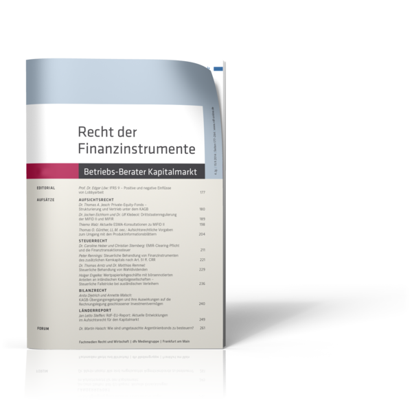 Recht der Finanzinstrumente (RdF) beleuchtet als juristische Spezialzeitschrift Finanzinstrumente aus aufsichts-, zivil-, steuer- und bilanzrechtlicher Perspektive. Zugleich werden betriebswirtschaftliche Implikationen untersucht. Neue Finanzierungsformen und -instrumente werden vorgestellt, ihre Einsatzmöglichkeiten in der Praxis diskutiert. Die jährlich stattfindende RdF-Jahrestagung bietet darüber hinaus eine persönliche Austauschplattform.