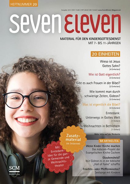 SevenEleven ist das Materialheft für Kindergottesdienstmitarbeiter, die mit 7- bis 11-Jährigen die Welt der Bibel erforschen wollen. Das Magazin bietet zweimal im Jahr zeitgemäße und kreative Einheiten, die einen fröhlichen, alltagsbezogenen Zugang zu Gott und der Bibel möglich machen. Jede Ausgabe enthält 20 ausgearbeitete Einheiten, die die Kinder mitten in ihrer Lebenswelt abholen und erstnehmen. SevenEleven möchte dabei helfen den Kindern eine Tür zu Gott, dem Glauben an ihn und der Bibel zu öffnen.
