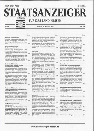 Der Staatsanzeiger für das Land Hessen ist amtliches Veröffentlichungsorgan der obersten Landesbehörden des Landes Hessen und wird seit dem Jahre 1946 herausgegeben. Das wöchentlich erscheinende Amtsblatt beinhaltet einen Amtlichen Teil, der die von den obersten Landesbehörden erlassenen Verwaltungsvorschriften, Vorschriften mit Rechtssatzcharakter und Bekanntmachungen enthält. Veröffentlicht werden hierin auch die Verordnungen und Rundverfügungen der Regierungspräsidien sowie Entscheidungen des Staatsgerichtshofs des Landes Hessen. Dem Öffentlichen Anzeiger lassen sich Gerichtsangelegenheiten, Liquidationen, Konkurse, Insolvenzen, Zwangsversteigerungen sowie Stellenangebote und Öffentliche Ausschreibungen entnehmen. Homepage: www.staatsanzeiger-hessen.de