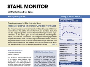 Stahl Monitor orientiert sich an den Informationsbedürfnissen der stahlverarbeitenden Industrie. Exklusive Berichte zur Marktentwicklung von Stahlprodukten wie Kaltband, Warmband, Walzdraht und Edelstahl, aktuelle Nachrichten und detaillierte Recherchen zu Themen wie z.B. Erzeugerstrategien oder Konsolidierungstendenzen liefern wichtige Informationen, die für eine fundierte Beurteilung des Stahlmarktes unverzichtbar sind.