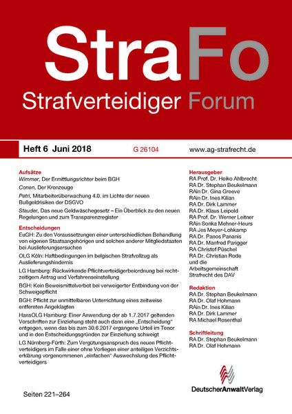 Strafverteidiger Forum ist praxisnah: vom richtigen Einstieg in das Mandat zu besonderen Formen der Verteidigung, Verteidigungskonzept, Prozessanalysen Strafverteidiger Forum informiert über die aktuelle Rechtsprechung und Gesetzgebung Die Zeitschrift ist ein Diskussionsforum für alle Belange der Strafverteidigung.