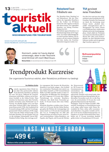 touristik aktuell, die führende Counterfachzeitschrift mit der höchsten verbreiteten Auflage von über 22.600 Exemplaren und berichtet seit über 50 Jahren über die Entwicklungen der Branche. In 14-tägiger Erscheinungsweise bereitet touristik aktuell angesagte Trends und Themen kompetent und objektiv auf. touristik aktuell bringt die wichtigsten Informationen auf den Punkt - ohne dabei an der Oberfläche zu bleiben. Reportagen, Analysen und Schwerpunkte gehen in die tiefe und bieten Einblick in Hintergründe. Praxistipps für das Tagesgeschäft und Kommentare runden das Angebot ab. Zu den Lesern von touristik aktuell zählen die Entscheider am Point of Sale, aber auch die Mitarbeiter von Leistungsträgern wie Reiseveranstaltern, Transportunternehmen, Hotelbetrieben und Fremdenverkehrsbüros - kurzum alle, die sich über Reiseindustrie auf dem Laufenden halten wollen.
