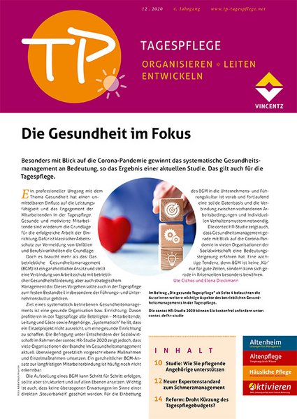 Als Tagespflegeleitung erleben Sie es täglich: Die inhaltlichen, qualitativen, rechtlichen und wirtschaftlichen Rahmenbedingungen, unter denen Sie Ihre Einrichtung führen müssen, sind komplex. Die Anforderungen an Sie als Leitung steigen und die Zeit, die Ihnen täglich zur Verfügung steht, ist knapp bemessen. Die Fachzeitschrift TP – Tagespflege organisieren, leiten, entwickeln unterstützt Sie dabei, Ihre täglichen Aufgaben professionell umzusetzen, Sie sparen Zeit und sind stets auf dem aktuellen Stand.