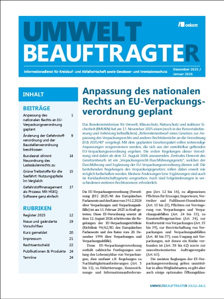 Sie sind in einem Unternehmen tätig und täglich mit den neuen Herausforderungen des Umweltschutzes befasst? Sie wollen in der Flut neuer Gesetze, Verordnungen, Gerichtsentscheide, Publikationen und Kommentare zum Umweltrecht den Überblick behalten? Dann ist UmweltbeauftragteR, der monatliche Infodienst für Kreislauf- und Abfallwirtschaft sowie Gewässer- und Immissionsschutz, für Sie eine unverzichtbare Lektüre. Experten aus Praxis und Beratung liefern Ihnen die entscheidenden Informationen, damit Sie in ihrem Betrieb die anstehenden Umweltaufgaben sicher lösen können.