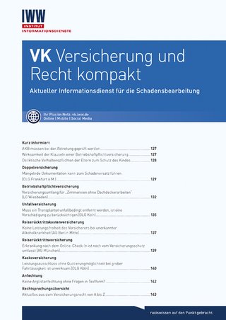 VK Versicherung und Recht kompakt ist der aktuelle Informationsdienst für den Praktiker im Versicherungsrecht. Namhafte Experten aus Rechtsprechung und anwaltlicher Praxis liefern konkrete Empfehlungen und praktische Arbeitshilfen für die erfolgreiche Bearbeitung Ihrer versicherungsrechtlichen Fälle.