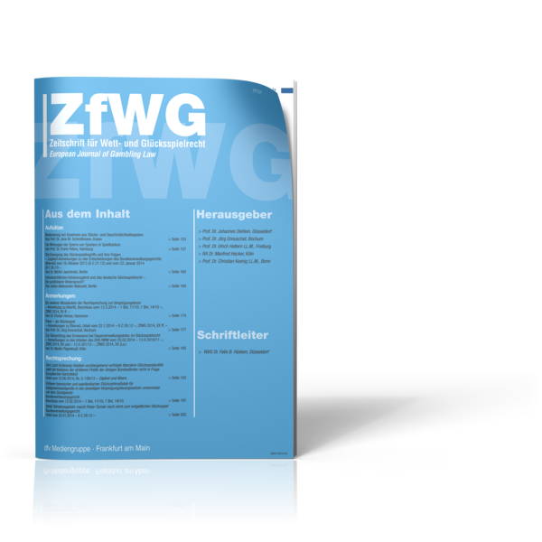 Die Zeitschrift für Wett- und Glücksspielrecht (ZfWG) ist die einzige Publikation für Wett- und Glücksspielrecht. Sie bietet kompetent, zeit- und praxisnah Expertenbeiträge und neueste Rechtsprechung zu allen aktuellen Fragen und ist damit in der Rechtsprechung, Literatur und Wissenschaft ein unverzichtbares Nachschlagewerk für alle, die sich in diesem Rechtsbereich stets auf dem aktuellen Stand halten wollen.