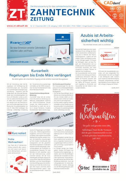 Die ZT Zahntechnik Zeitung ist das einzige unabhängige Zeitungsformat mit dem Schwerpunkt aktuelle Berufspolitik und Laborführung in der Zahntechnik. Die branchenerfahrene Redaktion der ZT besteht aus Zahntechnikern, Betriebswirten des Handwerks und Fachjournalisten. Sie dokumentiert und interpretiert die Entwicklung des deutschen Dentalmarktes in den Ressorts Politik, Wirtschaft, Technik und Service und gibt dem Zahntechniker wichtige Impulse für den Laboralltag sowie für die strategische Positionierung im wachsenden Wettbewerbsumfeld.